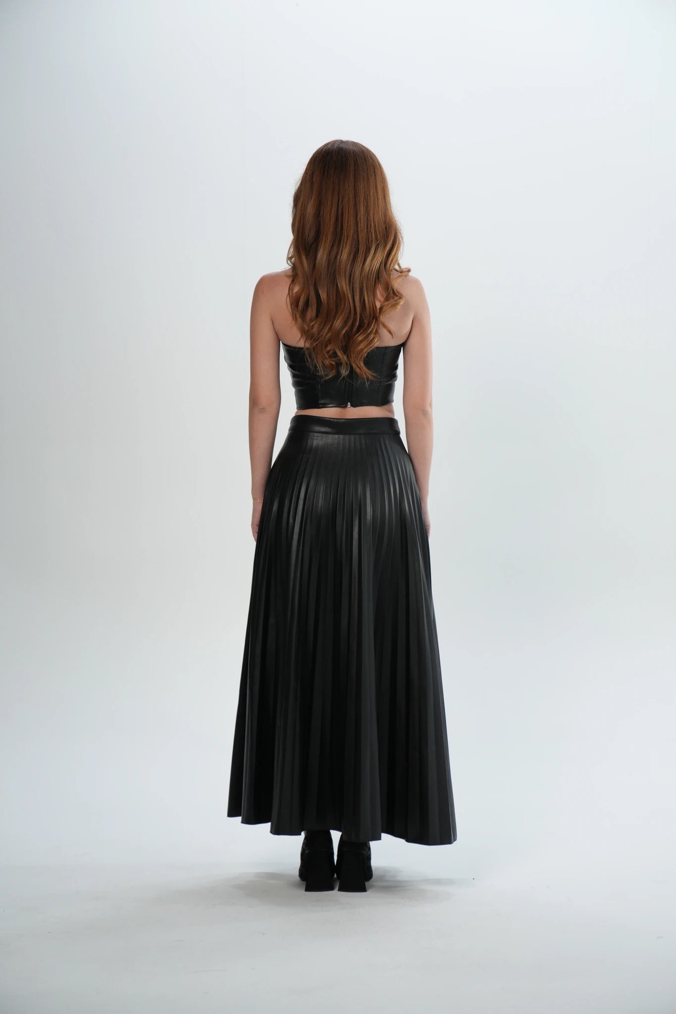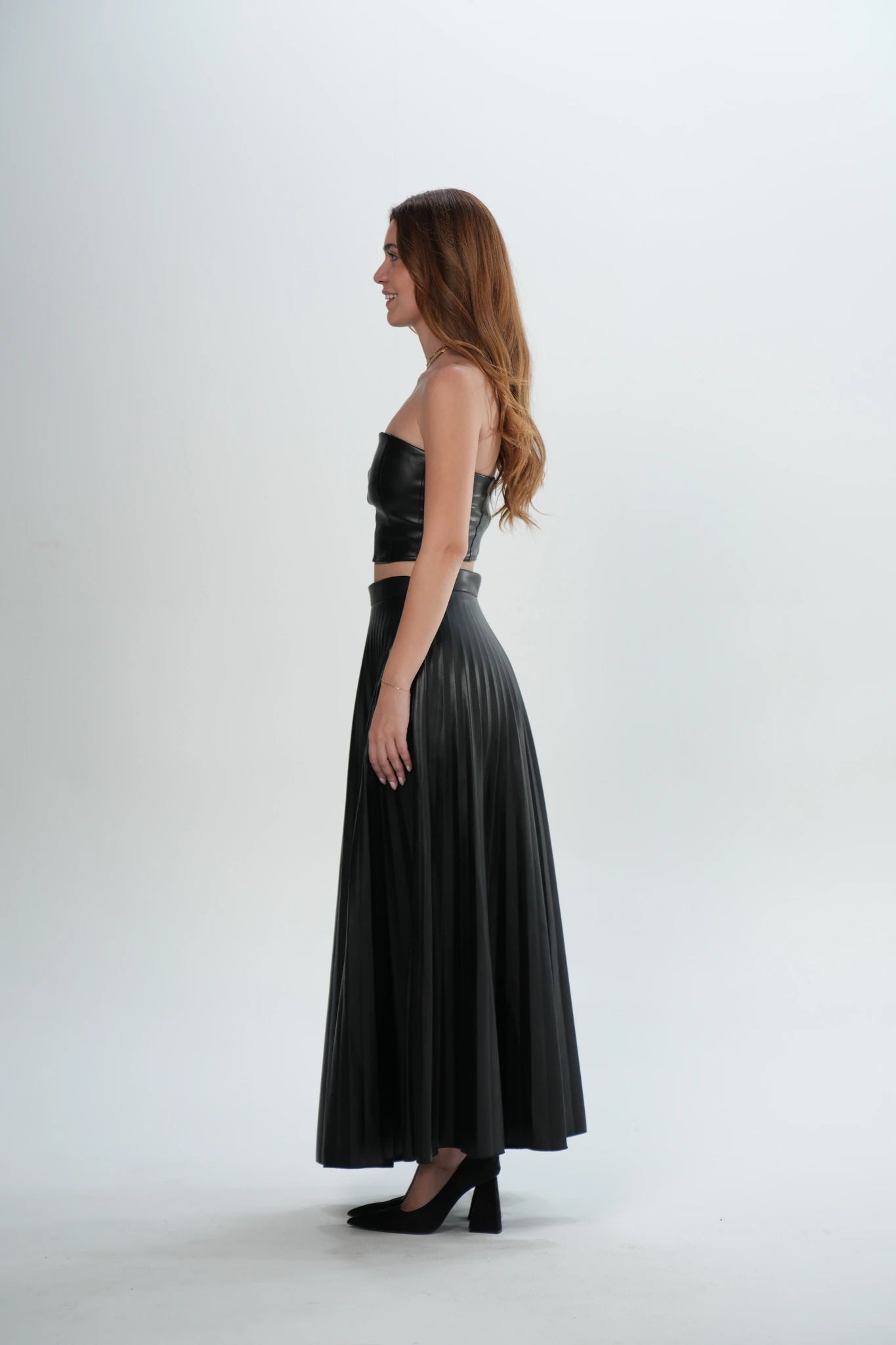 Two-piece faux-leather set featuring a structured cropped top with square neckline and a high-waisted pleated maxi skirt. Designed to balance boldness and elegance, the Ezra Set adds a statement edge with its sleek finish and fluid movement. Perfect for modern evening looks or elevated daywear. Wipe clean with a soft damp cloth. Do not machine wash. Made in Lebanon.