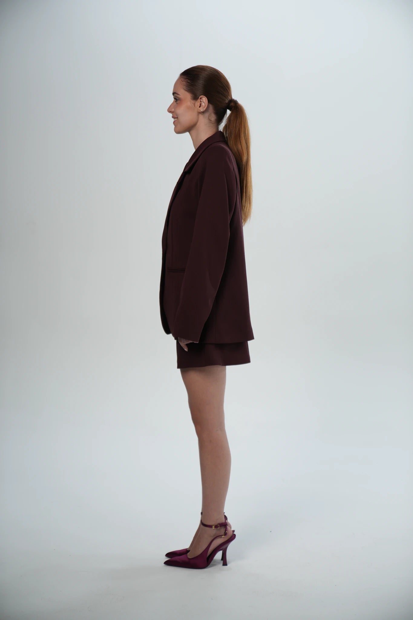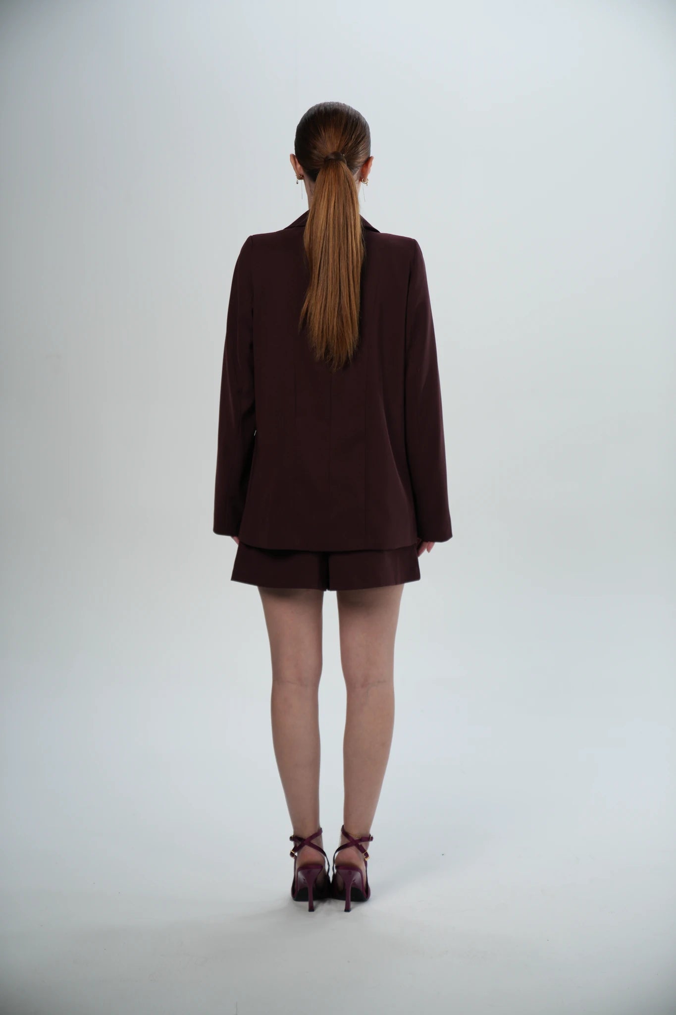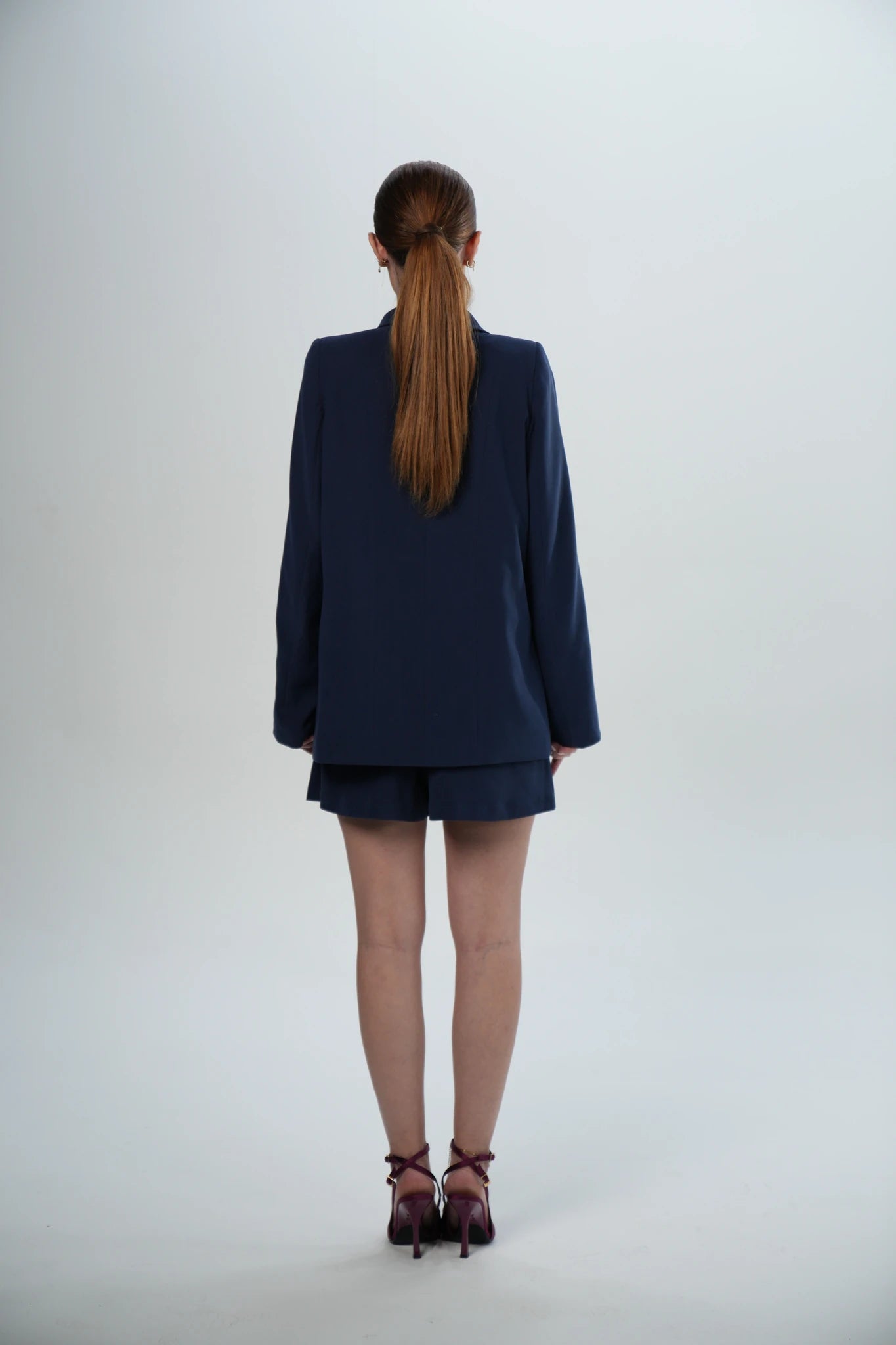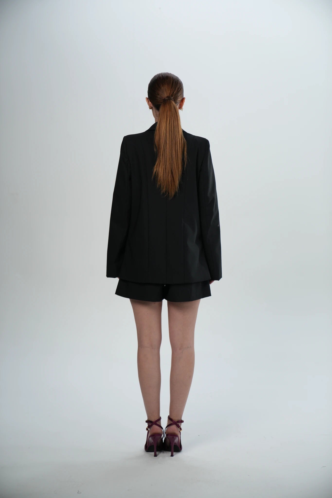 Oversized blazer and shorts set crafted from smooth crepe fabric. The blazer features a relaxed, structured silhouette with a sharp lapel collar and a single gold button closure for an elevated finish. Paired with tailored high-waist shorts, the Reva Set blends modern elegance with effortless comfort — perfect for day-to-night sophistication. Machine wash or dry clean. Made in Lebanon.